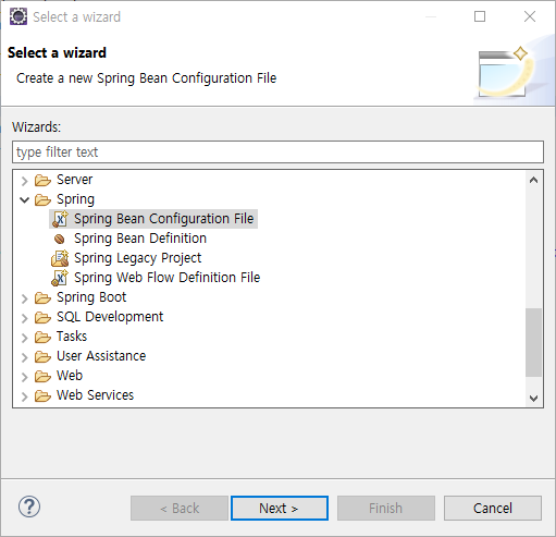 물론 이클립스에 스프링 플러그인이 깔려있는 상태여야 한다. 상위 패키지에서 오른쪽 마우스 > New를 누른다. setting.xml 등의 이름으로 xml파일을 하나 만든다.