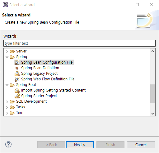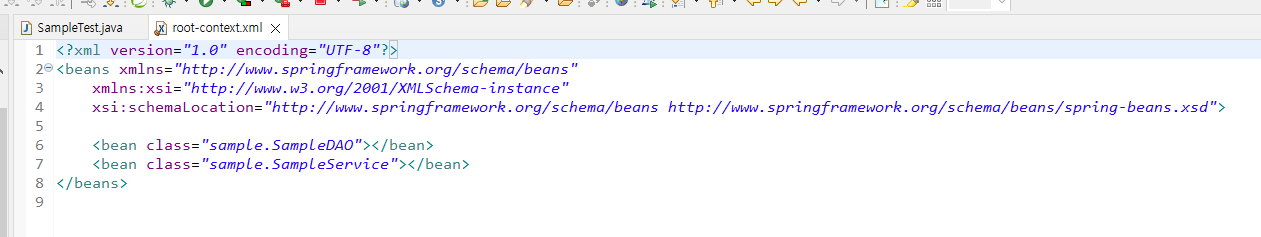 막 파일을 생성했을 땐 아래와 비슷한 상태일 것이다. <beans> 아래로 <bean> 클래스를 작성한다. 아까 생성한 샘플 클래스파일을 불러오는 내용이다.