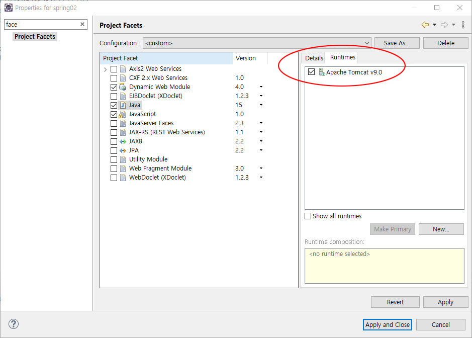 1. 아까 속성 > 페싯으로 들어가 자바 오른쪽 창 런타임에 톰캣 체크가 안돼있다면 체크한다.