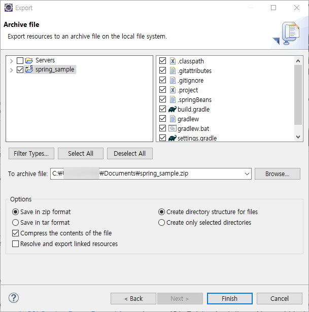 File > Export > General > Archive File 로 내보내면 프로젝트가 압축파일로 내보내진다.