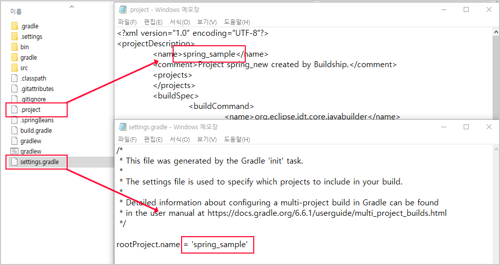 워크스페이스 내에 이름이 동일한 프로젝트가 있으면 불러올 수 없다. 때문에 필요에 따라 내보낸 압축파일을 압축해제한 후 폴더 내에 프로젝트 이름을 변경해준다. 그레이들 빌드 프로젝트의 경우엔 파일 3개를 변경해야 프로젝트 이름이 변경된다. 이름을 변경한 후엔 다시 압축한다.