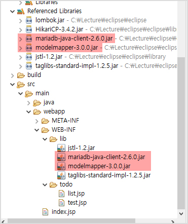 프로젝트 빌드패스 뿐만아니라 WEB-INF/lib 에도 jar파일을 끌어와야 동작함. (그냥 윈도우 폴더에서 마우스로 끌어다 놓으면 됨)